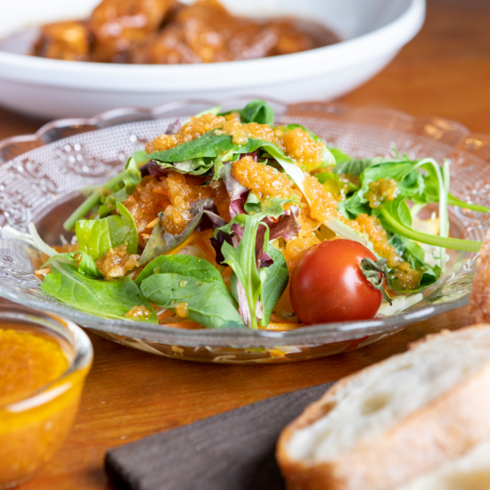 「じっくり煮込んだ牛タンシチュー」を温めて器に盛りつけ、お好みでライスやパンと生野菜をご用意いただき、ホテル特製「野菜を食べるドレッシング」をかければ素敵なディナーが簡単に完成します。